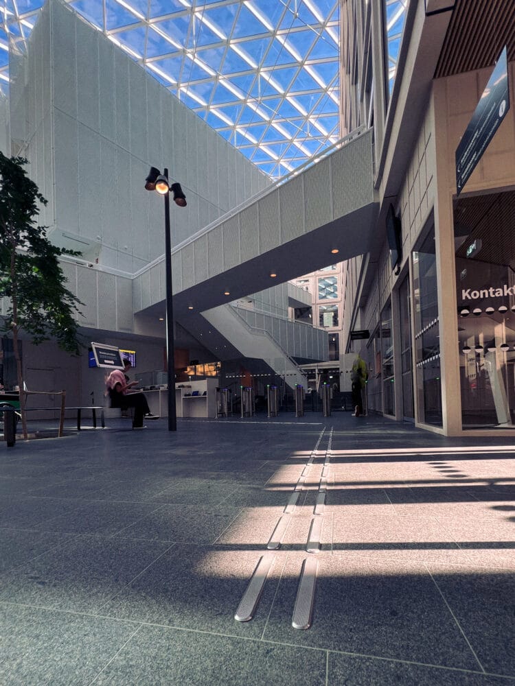 Taktile ledelinjer i rustfritt stål og kontrastmerking av gulv, vindus og glass.