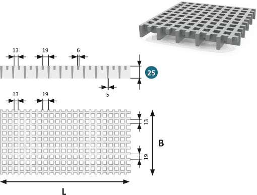 GRP rist 25 er en robust og finmasket gitterrist av glassfiberarmert plast (GRP) med en høyde på 25 mm og en maskestørrelse på 20×20 mm (innvendig 13×13 mm). Denne modellen kombinerer høy bæreevne med en tett struktur som hindrer små gjenstander i å falle gjennom – noe som gjør den spesielt egnet for gangveier i industrimiljøer.