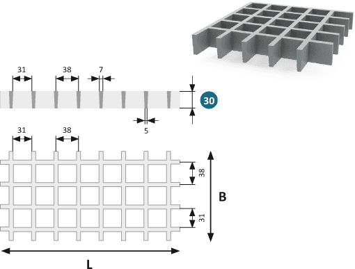 GRP Gitterrist 30 er en slitesterk og allsidig rist laget av glassfiberarmert plast (GRP), med en høyde på 30 mm og en maskestørrelse på 38×38 mm (innvendig 31×31 mm).