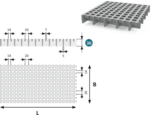 GRP Gitterrist 30 Micro er en kraftig, finmasket gitterrist av glassfiberarmert plast (GRP). Med en høyde på 30 mm og en maskestørrelse på 20×20 mm (innvendig 14×14 mm) kombinerer en høy bæreevne med tett maskestruktur som effektivt hindrer små gjenstander eller verktøy i å falle gjennom.