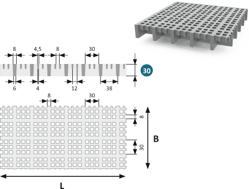 GRP Gitterrist 30 Micro med masker på 8×8 mm (30×30 mm over 4 masker) og 30 mm profilhøyde er en tett og ekstremt robust gitterrist av glassfiberarmert plast (GRP). Den finmaskede strukturen hindrer selv svært små gjenstander i å falle gjennom.