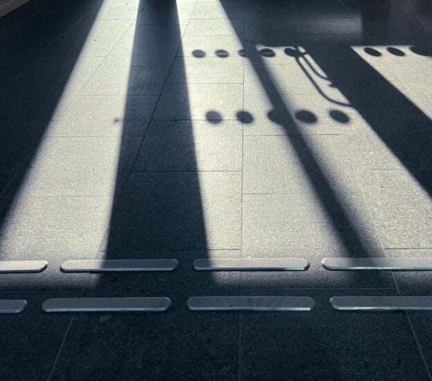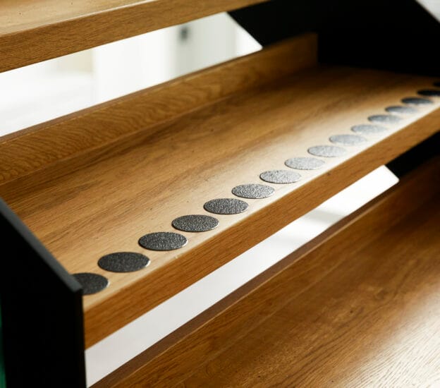 Trapper bør ha kontrastmarkering på topp- og bunntrinn i hvert trappeløp, og markeringen bør være konsekvent i hele bygningen – enten med prikker eller linjer. Det er spesielt viktig med kontrastmarkering av trapper og trinn som er plassert der man ikke forventer det.